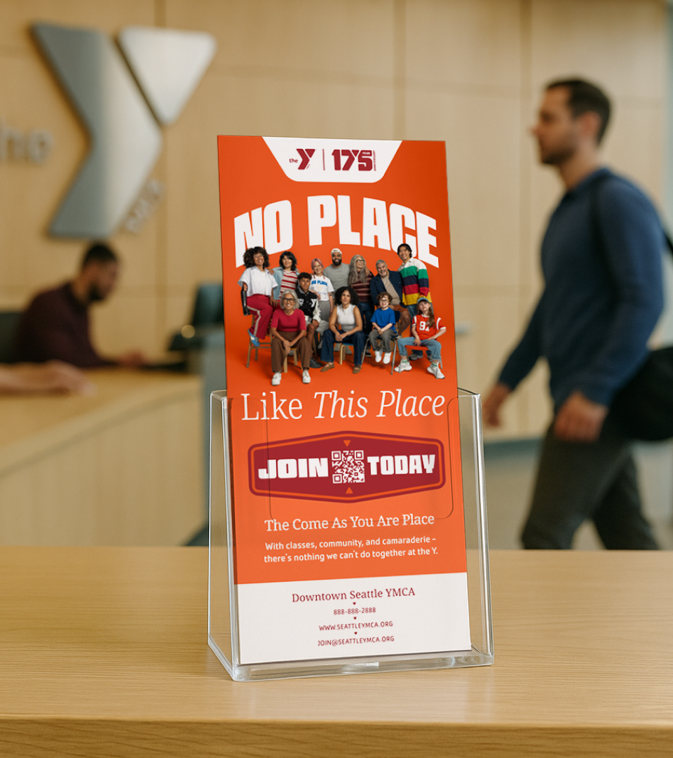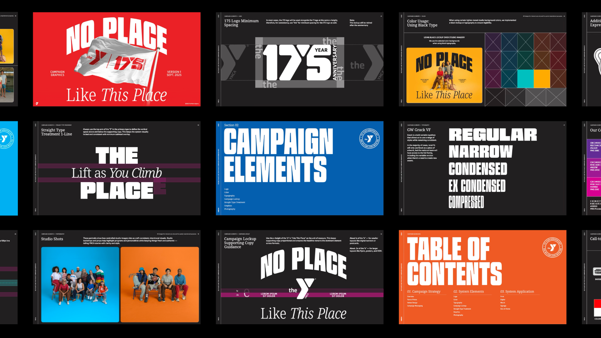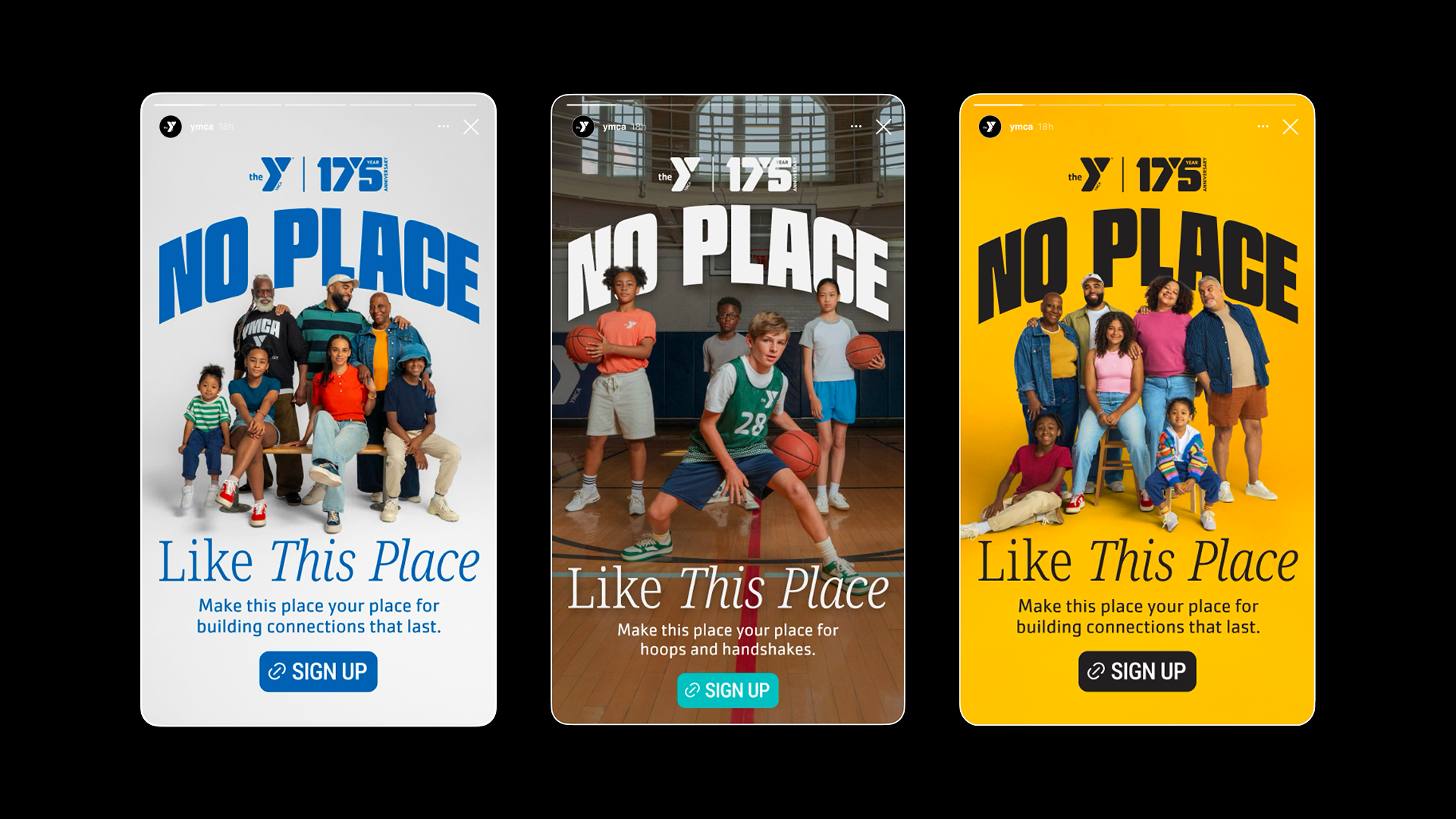 The YMCA is one of the country’s largest nonprofits, with more than 2,500 locations serving as hubs for health, learning, and community. For its 175th anniversary, the national Y wanted to reappraise what the organization represents today. We built a bold, modular design system that reveals each YMCA as a modern, vibrant place of connection—captured in the line “No place like this place.”
